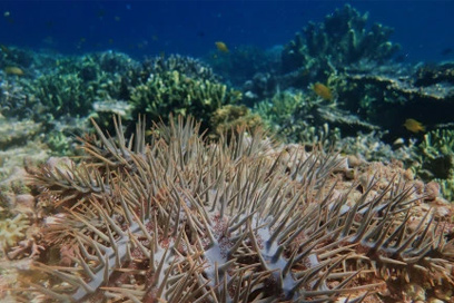 The coral reefs in Indonesia are being destroyed by a lovely star fish, the Crown of Thorns, COT. The locals are trying to re...